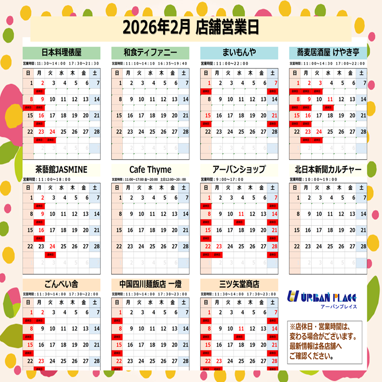 おかいものおでかけくらしグルメわくわくNEWS おかいもの2026.02.02【ご案内】アーバンプレイス店舗2月営業日 ポスト シェア 送る 寒い日が続いておりますが、皆さまいかがお過ごしでしょうか。 アーバンプレイステナント2月営業日のご案内です🌸 店舗営業時間 皆様のお越しをお待ちしております。 アクセス 富山駅北口 徒歩3分富山市牛島町18-7