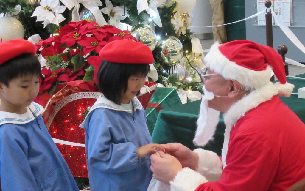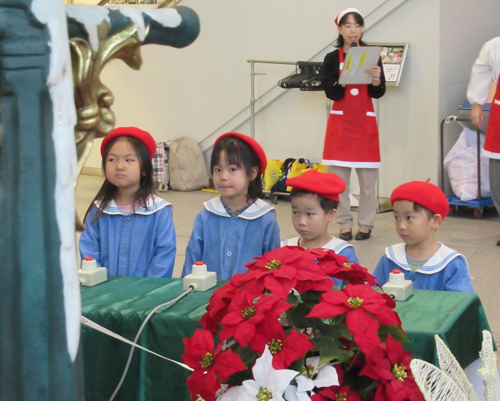 園児たちによる「どんぐりころころ」と「赤鼻のトナカイ」の合唱が披露されました。会場は一気にクリスマスムードに包まれ、見ている人たちの笑顔が広がりました。